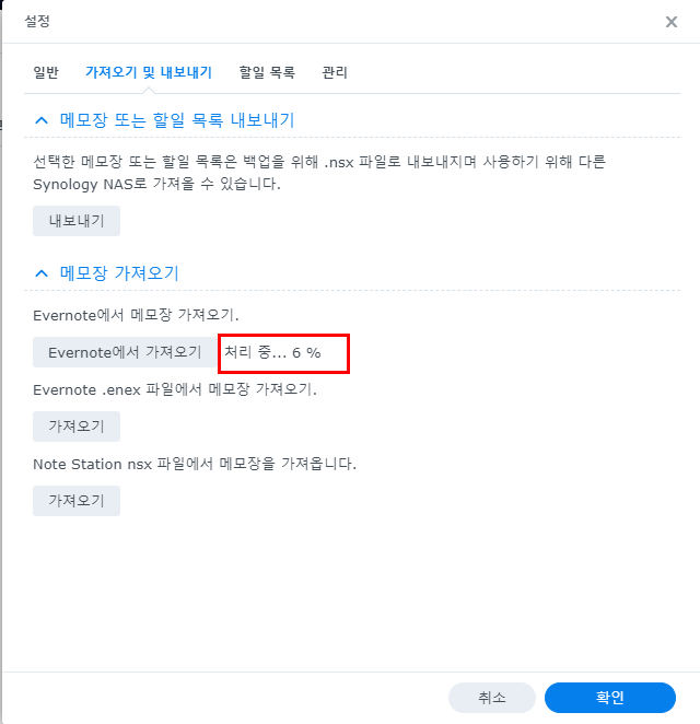 처리 중 상태가 표시되며 100%가 되면 기존 사용하던 에버노트를 이어서 사용 가능합니다.