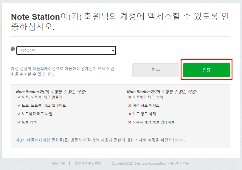 에버노트 인증 요청을 합니다.