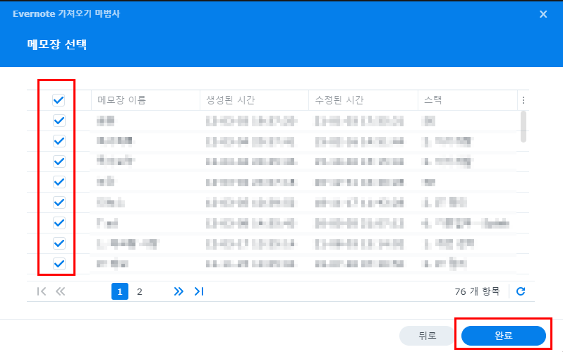 에버노트로 부터 가져올 모든 메모장을 선택 하고 확인을 클릭 합니다.
