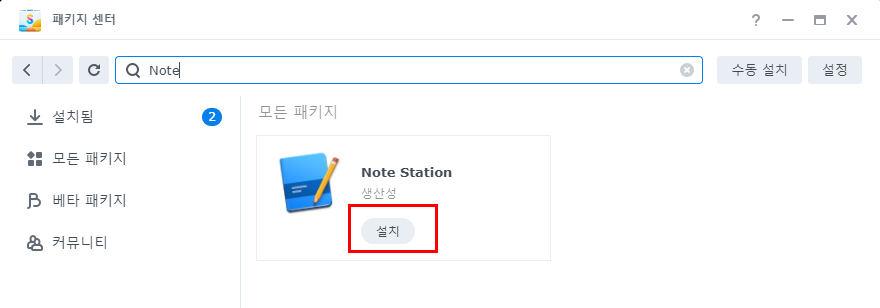 우선 패키시 센터에서 Note Station을 검색하여 설치 합니다.