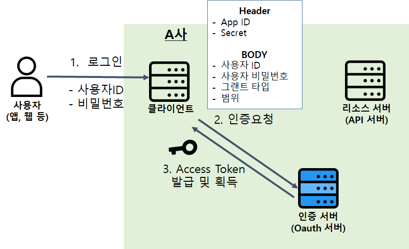 - 이와 함께 클라이언트는 사용자의 계정 정보와 보유하고 있는 리소스 서버의 App ID와 Secret, 그랜트 타입, 범위 값을 이용하여 Access Token 발급 요청을 합니다.