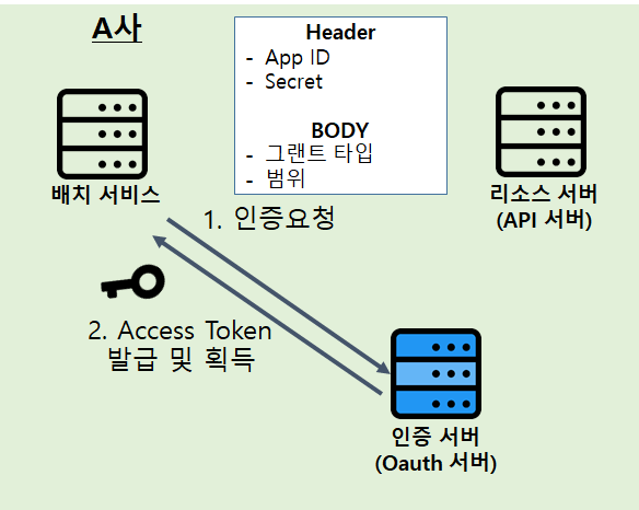 - Access Token을 획득하기 위해서 배치 서비스는 보유하고 있는 리소스 서버의 App ID와 Secret, 그랜트 타입, 범위 값을 이용하여 Access Token 발급 요청을 합니다. (사용자로부터의 요청이 아니기에 사용자 ID와 비밀번호는 필요가 없습니다.)