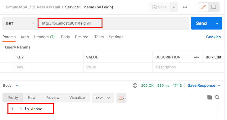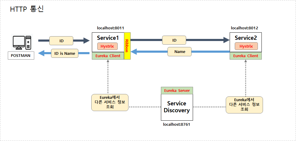 - 서비스1 : 서비스2의 "/name/{id}"를 호출하고 이름을 전달받아서 결과를 클라이언트로 전달 합니다.