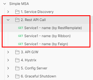 Eureka 서버와 서비스1과 서비스2를 기동합니다. 그리고 Github에 포함된 Postman Collection을 import하여 실행합니다.